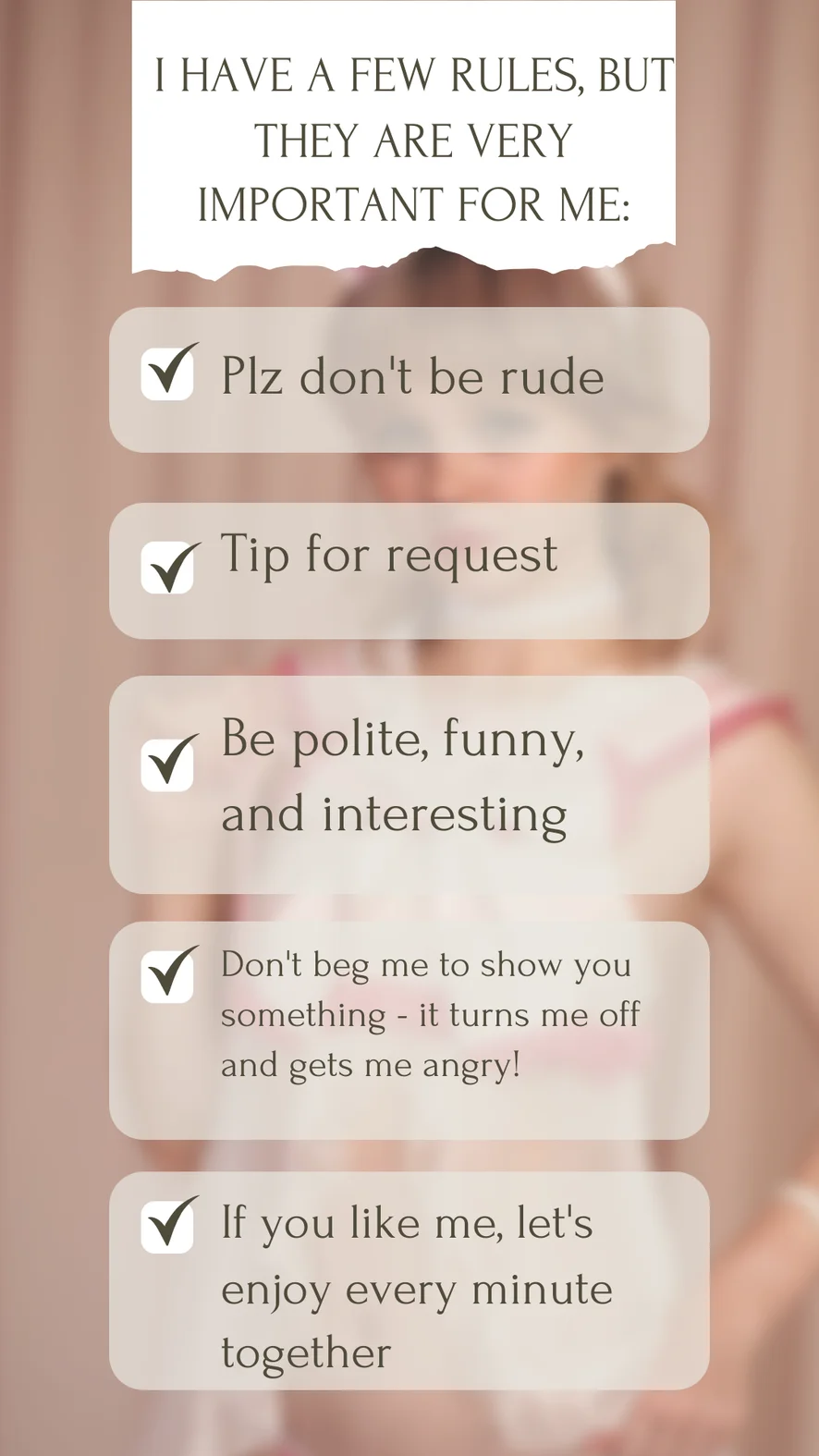 Ahegao, Nylon, Fetiche por Pés, Dança Erótica, Pata de Camelo, Dominadora, Punheta, Masturbação, Fingering, Foda de mamas, Felácio, Canzana, Classificação de Paus, Striptease, Topless, Dildo ou Vibrador, Yoga, Cosplay, Fumar, Orgasmo, Saia acima, Cowgirl, Corno, Role Play, Brinquedos Sexuais, Humilhação, Palmadas